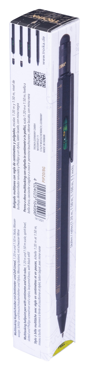 • Ten innowacyjny długopis mieści wszystko, czego w danym momencie potrzebujesz: linijka 10 cm i 4 cale, skalę 1:20 i 1:50, poziomicę, śrubokręt płaski i krzyżakowy oraz rysik do ekranów dotykowych.