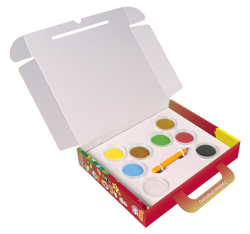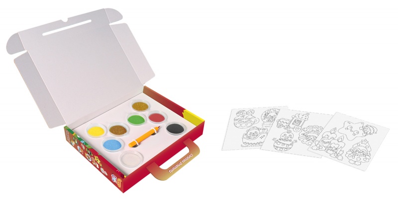 • kolorowy zestaw do malowania piaskiem w poręcznej walizce zawierający 8 słoiczków z piaskiem w różnych kolorach, rysik oraz 9 świątecznych postaci