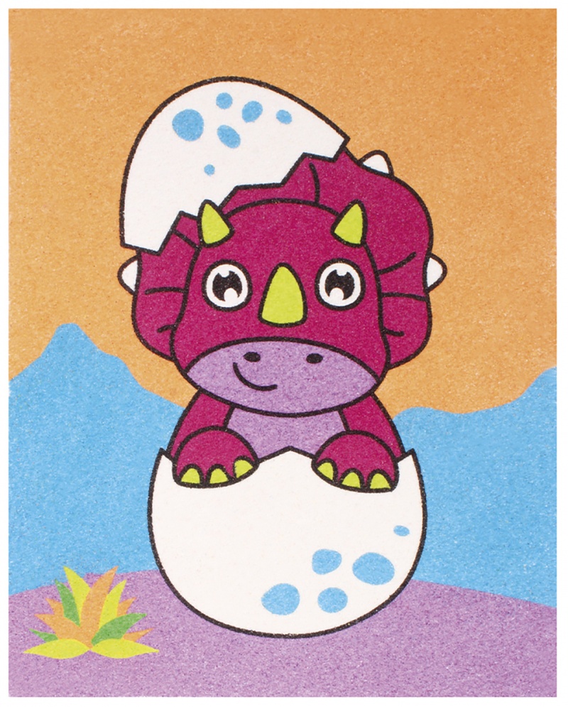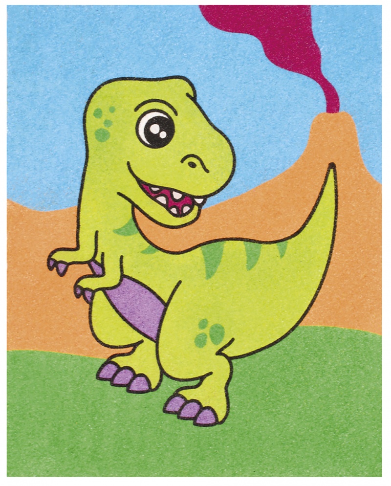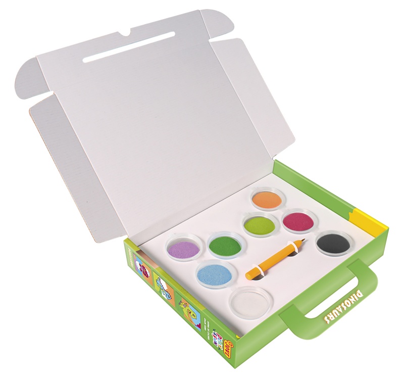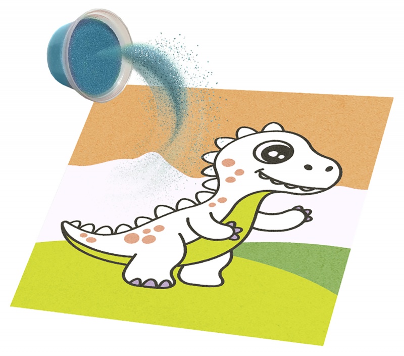 • dzięki kolorowemu piaskowi i szablonom z rysunkami uroczych dinozaurów dzieci mogą stworzyć własny kolorowy obrazek
