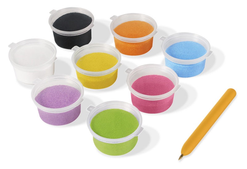 • 8 kolorów piasku (po 40 g) w zamykanych pojemniczkach
