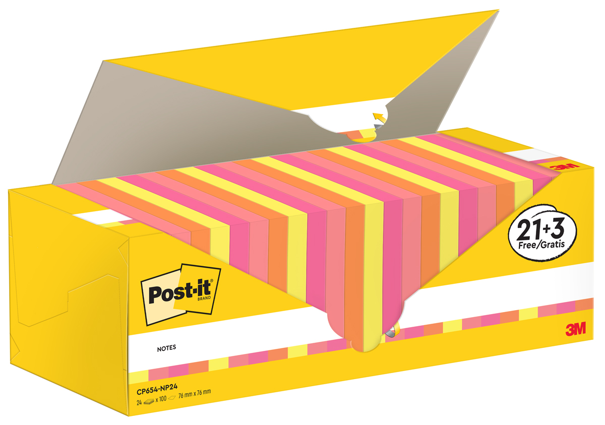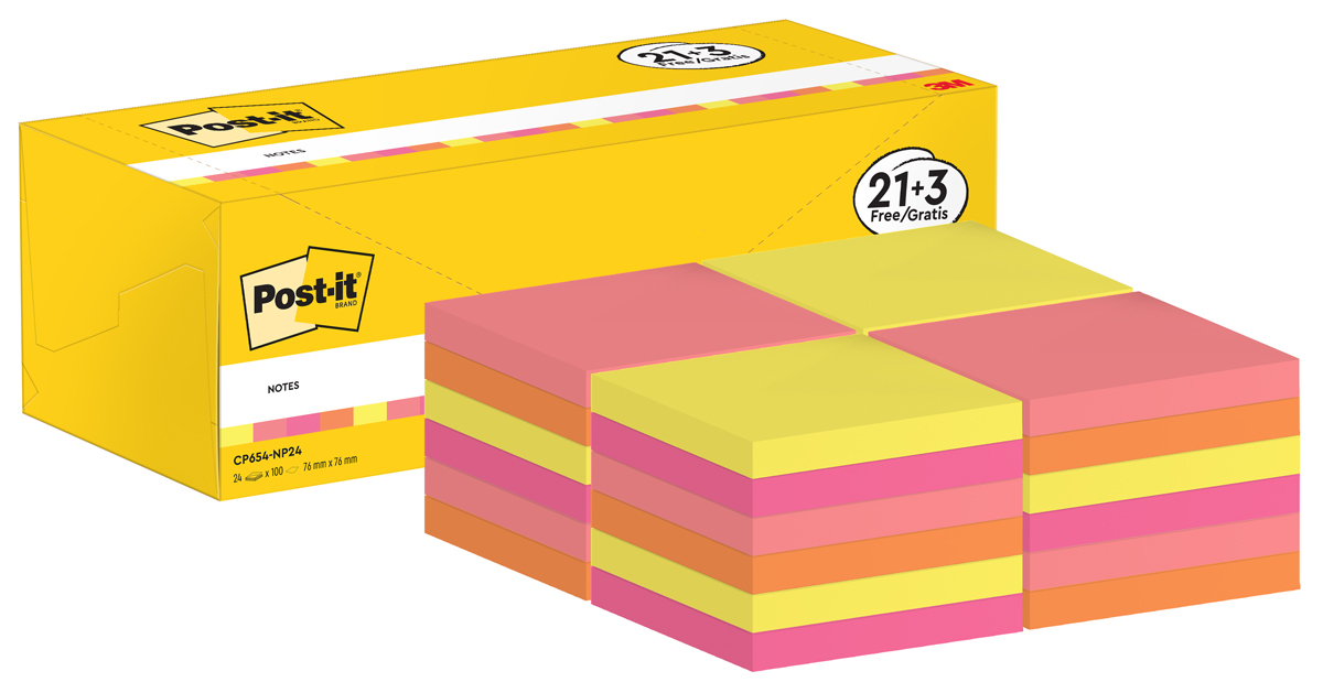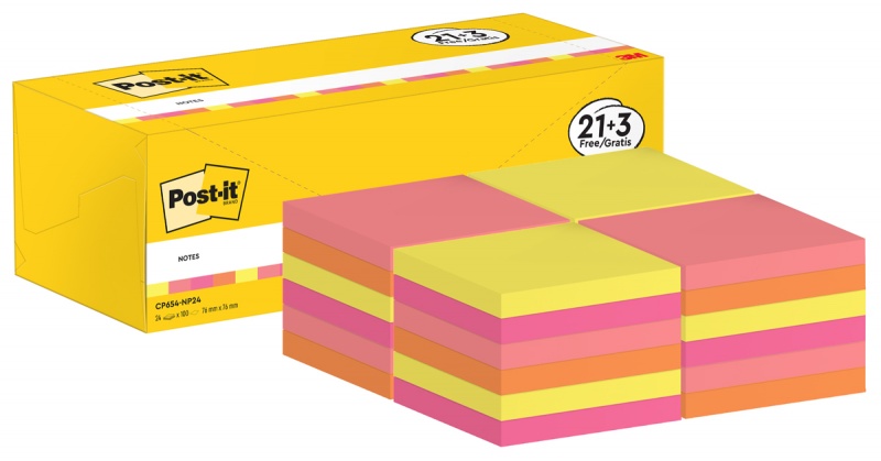 Sticky notes pad POST-IT® (654-NP24), 76x76mm, 100 sheets/pad, 21 + 3 pads FREE, neon color mix